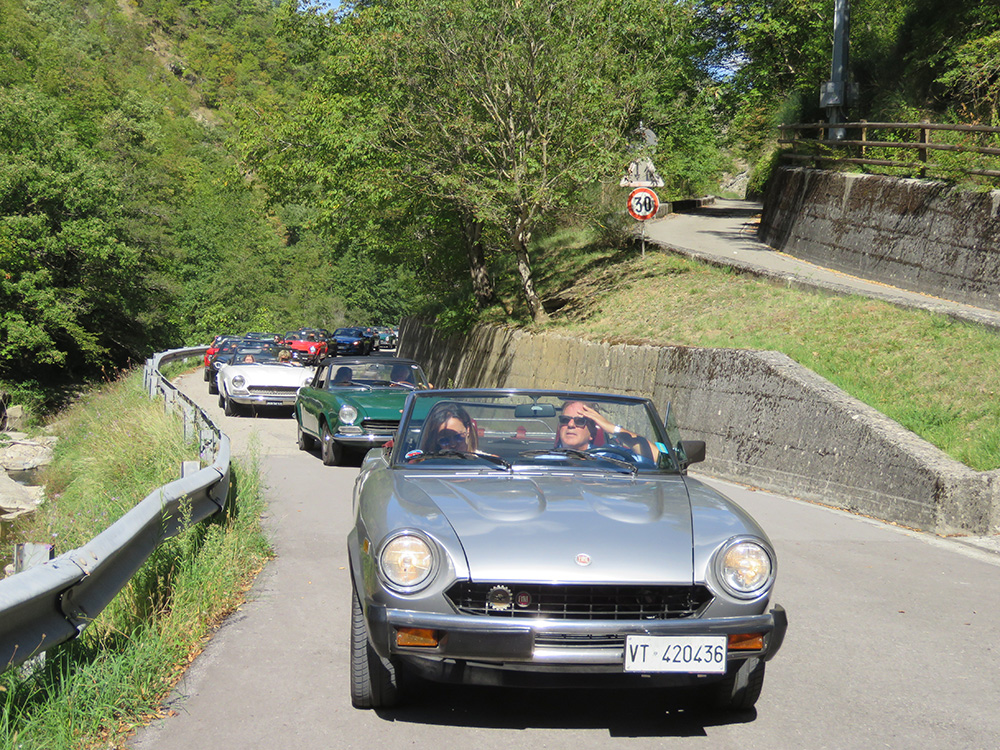 30 settembre 2025 66° Raduno, Settembre 2025. Santarcangelo e Diga di RidracoliSantarcangelo e Diga di Ridracoli con la 124 Spider Romagna mia… Romagna in fiore… tu sei la stella… tu sei l’amore… Tutti conosciamo a memoria questo motivo, che ci ha accompagnato idealmente in questo 66° raduno in terra di Romagna. Prima tappa e punto di ritrovo il borgo medioevale di Santarcangelo, dominata dalla Rocca medioevale dei Malatesta, ove alcuni ritengono che Paolo e Francesca siano stati uccisi, e non nel più noto castello di Gradara. Parlare di Romagna evoca ovviamente il litorale, le famose spiagge e la accesa vita notturna, ma Santarcangelo ci riporta in un’atmosfera medioevale ricca di storia e tradizioni, in cui la comunità conserva forte lo spirito romagnolo, caratterizzato dal senso dell’ospitalità e particolarmente sensibile ai temi sociali. Leggende e documenti storici attribuiscono poi a Santarcangelo la paternità del Sangiovese, i cui vitigni sono riportati in un documento notarile dei primi del ‘600. Santarcangelo annovera tra i propri cittadini personaggi di spicco tra cui Tonino Guerra, scrittore e sceneggiatore di fama internazionale, con oltre 120 film tra cui l’indimenticabile Amarcord. E parlando di cittadini famosi di Santarcangelo, nel corso della visita abbiamo anche incontrato casualmente l’attore Fabio De Luigi regista, scrittore, sceneggiatore che ha simpaticamente salutato il gruppo. La visita al borgo è stata brillantemente illustrata dalle guide locali che con competenza e capacità di coinvolgere i visitatori ci hanno accompagnato a scoprire un borgo molto curato, in cui abbiamo scoperto l’inattesa presenza di grotte, gallerie, ghiacciaie, vie di fuga, in cui nei secoli gli abitanti hanno racchiuso e conservato scorte di cibo e vino, riserve d’acqua e quanto necessario per sostenere i lunghi assedi che duravano mesi se non anni. Dal parcheggio alla partenza abbiamo trovato la completa e fattiva collaborazione delle istituzioni locali che hanno reso il nostro viaggio nel borgo una esperienza interessante e serena. Tragitto : 72 km sabato - 36 Km domenica